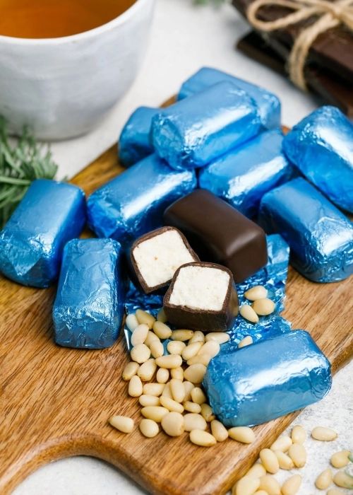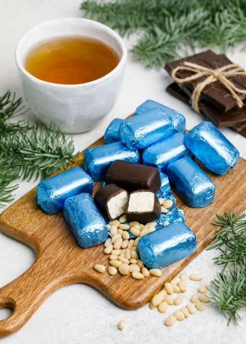 Кедровая метелица — это нежное молочное пралине с добавлением кедрового ореха, лесной земляники и японского чая матча, покрытое шоколадной глазурью.