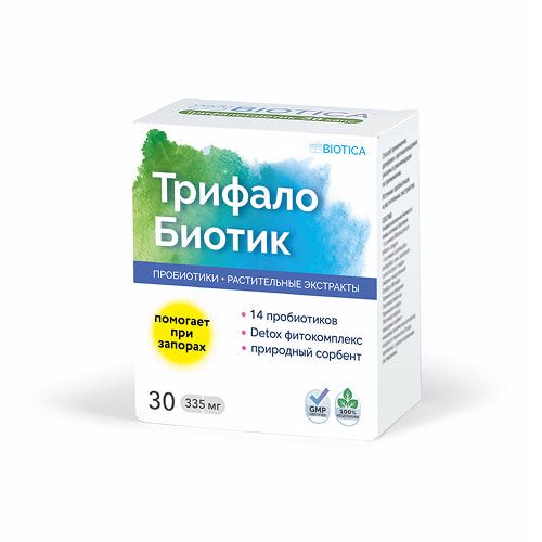 ТрифалоБиотик – инновационный отечественный фитобиотик для бережного очищения организма и восстановления полезной микрофлоры кишечника, созданный на основе современных достижений в области пробиотиков и знаменитой аюрведической формулы Трифала, доказавшей свою эффективность на протяжении нескольких тысячелетий. Трифала состоит из экстрактов трех плодов: амалаки, харитаки, бибхитаки. «Тот, кто принимает Трифалу, избавится от всех болезней и доживет до ста лет», – гласит трактат древнеиндийской медицины «Чарака Самхита». Комплексное действие пробиотиков и растительных экстрактов, входящих в состав ТрифалоБиотика, увеличивают эффективность компонентов Трифала, а также способствуют лучшему восстановлению кишечной микрофлоры.